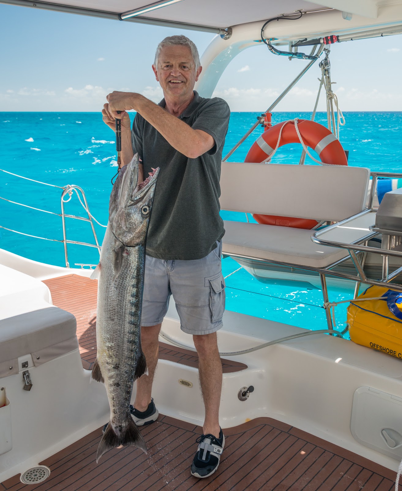 Resolute overtook us in the morning, and were anchored in Holmes Reef by the time we arrived. Just as we arrived I inconveniently hooked a large barracuda. George brilliantly kept us off the bommies until I got it landed after a big fight.